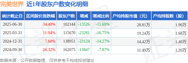 从股价来看,2025年3月31日至2025年6月30日,完美世界区间涨幅为34.4%,在此期间股东户数减少1.35万户,减幅为11.69%。